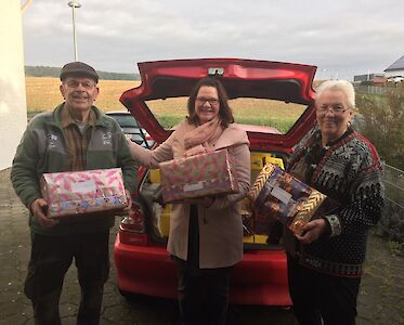 Fast unermüdlich sind Helga Ujma und Anton Krix aus Waldsolms unterwegs, um auf Flohmärkten und in Geschäften nach Ermutigungsgeschenken zu suchen, um „Hoffnungsboxen“ zu packen. Teilweise kommt man bei Frau Ujma Zuhaue gar nicht mehr die Treppe rauf, weil alles voller Paketen steht, erzählt sie anschaulich.