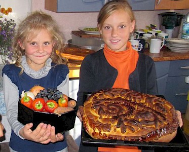 Dann kamen die Erntehelfer. Und nun ist unser Vorratsraum voll mit Kartoffeln für die kommenden Monate. Kinder erzählen, wie ihre Familien an unserer Gemüseaktion teilgenommen haben. Am Ende stehen wir alle im Kreis um den bunten Erntedanktisch und danken Gott für eine wunderbare Ernte.