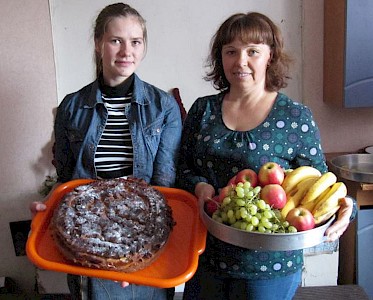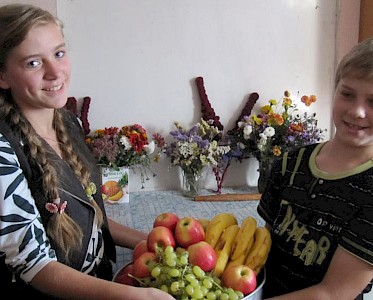Der Versammlungsraum in unserem „Zufluchtsort“ in Pawlowka ist festlich geschmückt. Da sind Obst, Gemüse und viele andere Dinge, die uns daran erinnern sollen, dass wir heute ein Erntedankfest feiern.