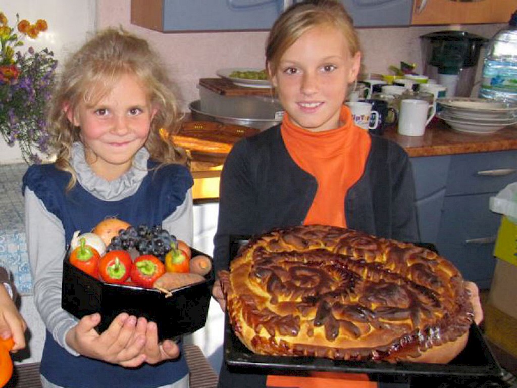 Dann kamen die Erntehelfer. Und nun ist unser Vorratsraum voll mit Kartoffeln für die kommenden Monate. Kinder erzählen, wie ihre Familien an unserer Gemüseaktion teilgenommen haben. Am Ende stehen wir alle im Kreis um den bunten Erntedanktisch und danken Gott für eine wunderbare Ernte.