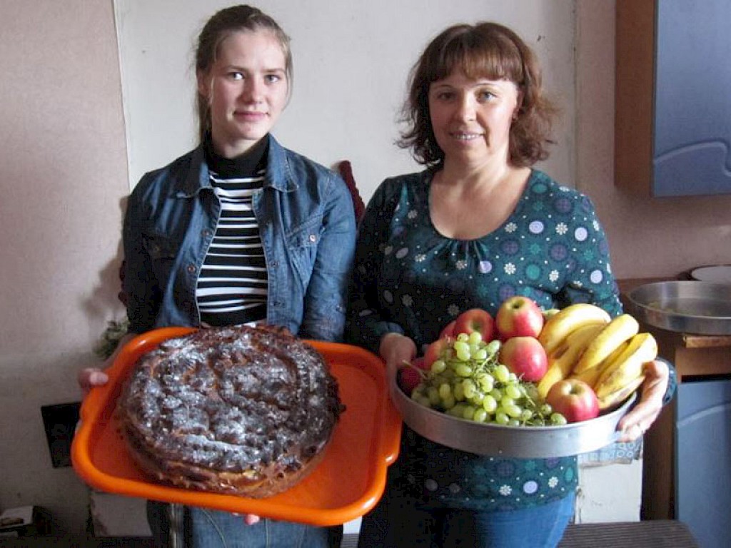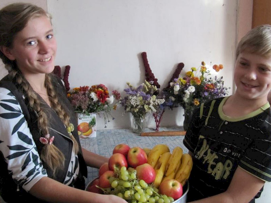 Der Versammlungsraum in unserem „Zufluchtsort“ in Pawlowka ist festlich geschmückt. Da sind Obst, Gemüse und viele andere Dinge, die uns daran erinnern sollen, dass wir heute ein Erntedankfest feiern.