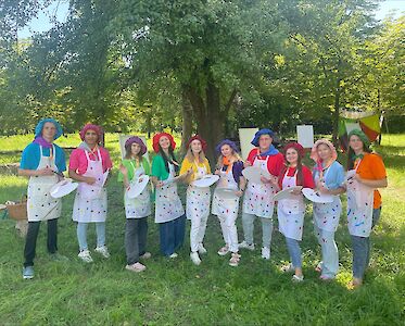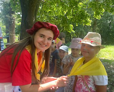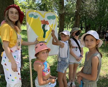 Eine Gruppe Künstler empfing gestern Morgen unsere Kinder auf dem Freizeitgelände des Sommerlagers. Verzweifelt standen sie vor ihren Leinwänden, da ihnen keine grandiose Idee für ein besonderes Bild einfiel. „Könnt ihr uns helfen?“, riefen sie den gerade ankommenden Kindern zu. Aufgeregt verteilten sich die Mädchen und Jungen in Gruppen um die Künstler, um ihnen beim Malen eines Bildes zu helfen.