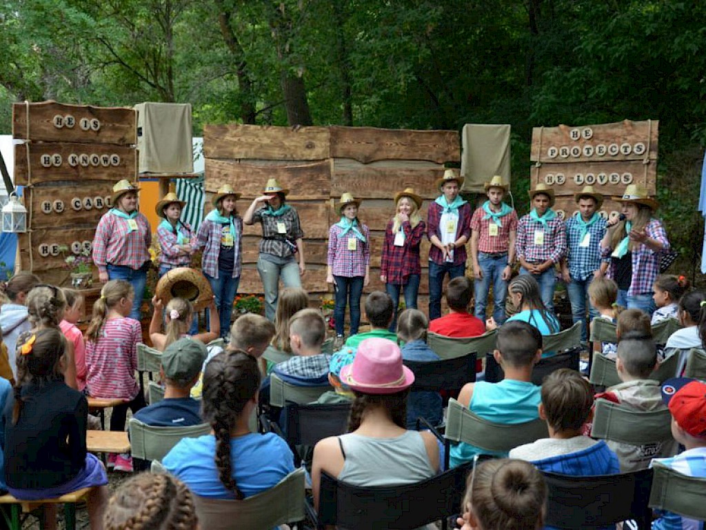 „Sie kommen! Sie kommen!“ Von weitem hört man Motorengeräusche. Ein wenig unsicher steigen erste Gäste aus Fahrzeugen, überwältigt von großen Bauernhöfen, die sich über das ganze Gelände erstrecken.Sofort werden sie in die Landwirtschaft eingeführt, dürfen gleich Hand anlegen. Wir laden Heu auf einen Anhänger, versorgen Pferde mit Wasser, melken Kühe, pflanzen Kartoffeln, pflücken Äpfel. Am Ende werden die besten Mitarbeiter gekürt. Da gibt es den „Melker des Tages“. Zehn Höfe haben unterschiedliche Aufgaben. Doch im Zentrum steht unsere Schafzucht, denn unser Thema lautet: „Er ist mein Hirte“. Am Bild eines guten Hirten, der seine Schafe liebevoll schützt und versorgt, wollen wir in den kommenden Tagen verstehen, wie Gott uns durch unser Leben begleitet. Die kleine Kamilla, aus einem „Vergessenen Dorf“, umklammert die Hand von Katja, ihrer Gruppenleiterin, will sie überhaupt nicht mehr loslassen. Sie ist so froh, dass ihr jemand Aufmerksamkeit, Liebe schenkt, etwas, das sie zu Hause kaum erlebt.„Gott ist da, auch wenn wir ihn nicht sehen!“ Unser Tagesthema legt ein Fundament für die ganze Freizeit. Kann man das beweisen? Warum fällt es uns leicht zu glauben, dass ein Künstler eine Skulptur geschaffen hat, aber so schwer, dass Gott die Erde, uns Menschen erschaffen hat? Bis spät in die Nacht sitzen Gruppen in ihren Zelten, diskutieren über diesen spannenden Gedanken, bis die Ersten in ihren Schlafsäcken verschwinden.