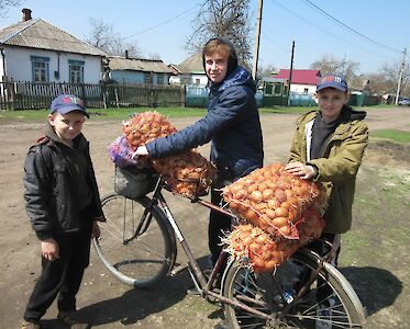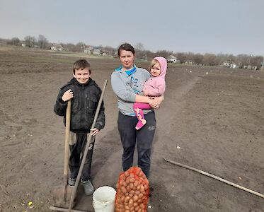 „Könnt ihr uns helfen? Wir haben kein Geld für Saatkartoffeln.“ Familie Chomenko hat fünf Kinder. Vor Kriegsbeginn arbeitete der Vater in der Stadt, bekam regelmäßigen Lohn. Jetzt hat er keine Arbeit mehr, Sozialleistungen werden nur verzögert ausgezahlt.
