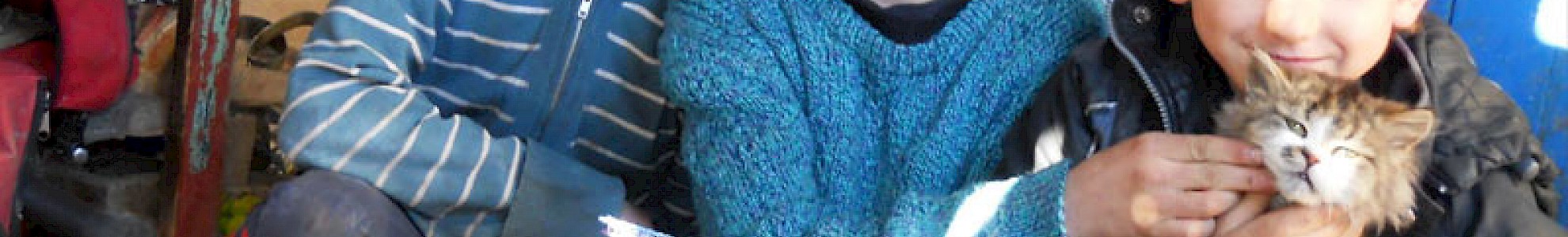Ihre Kinder sitzen alle um den warmen Ofen herum, den wir bereits im Herbst mit Holz versorgt haben. Nun haben sie erst einmal genug damit zu tun, die neue Kleidung anzuprobieren.