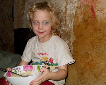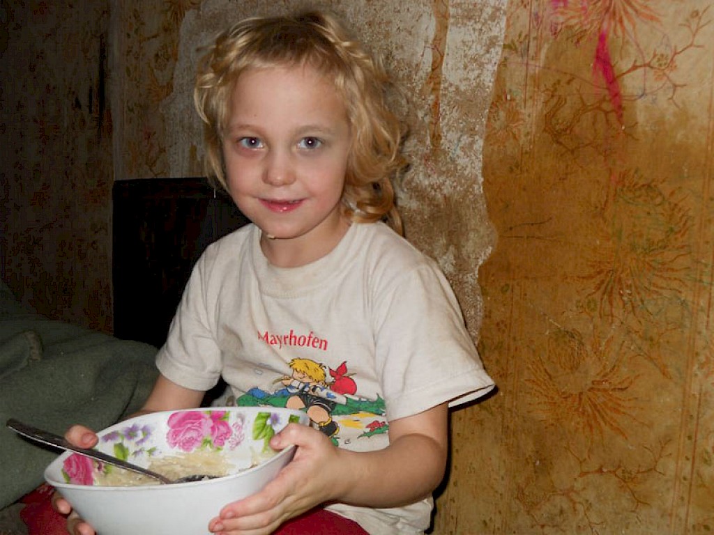 Mascha bringt für die Familie Kartoffeln und andere Lebensmittel. Die überglücklichen Kinder fangen an die Süßigkeiten und Kekse miteinander zu teilen, die sie nur selten zu Gesicht bekommen. Wir sind froh, dass wir Kinder aus Familien wie aus der Familie Odnorog unterstützen können. Aber wir sind auch besorgt, wenn die eigenen Eltern sich nicht um sie kümmern und ihnen sogar verbieten zu uns zukommen.