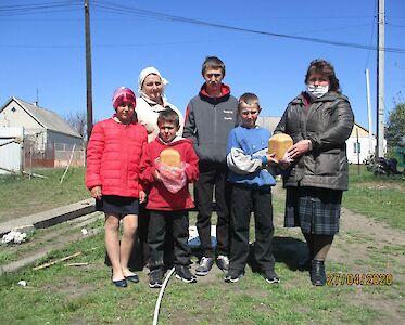 Nellja hat vier Kinder. Sie wohnen in einer ärmlichen Hütte. Wir haben ihnen nun geholfen Kartoffeln zu pflanzen und einen Gemüsegarten anzulegen. Familie Panschin ist eine von vielen, die in dieser schweren Zeit ums Überleben kämpfen.