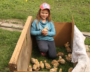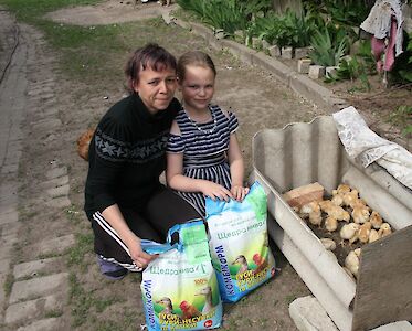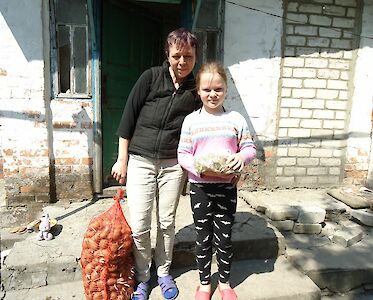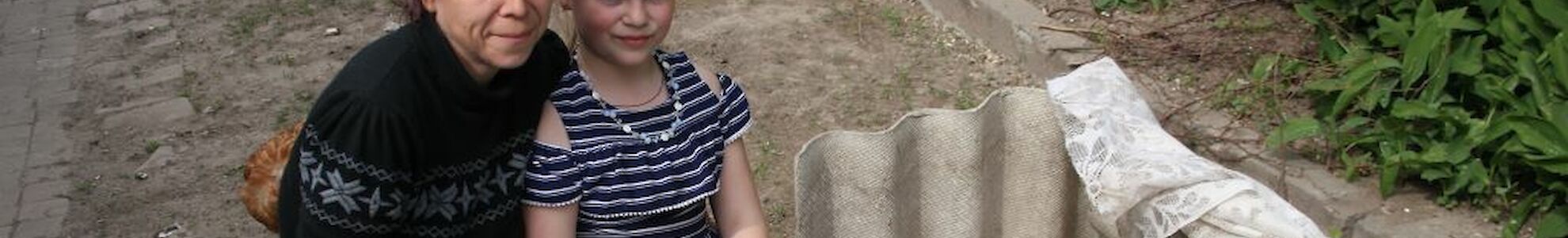 “Mein Mann und ich hatten so viele Pläne. Aber der Krieg machte alles zunichte. Es bleibt so viel Arbeit liegen.” Dschenja, der Familievater, meldete sich bereits in den ersten Kriegstagen freiwillig zur Armee. Oxana blieb mit den beiden Kindern allein zurück. Der ältere Sohn ist behindert. Jana, die Tochter, hilft der Mutter. Wir haben die Familie mit dem Kauf einer Ziege und mit Hühnerküken unterstützt. Die Ziege war trächtig und brachte zwei Zicklein zur Welt. So haben sie Milch und werden Fleisch und Eier essen können. Im Gemüsegarten wachsen Kartoffeln und Zwiebeln.