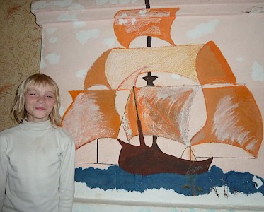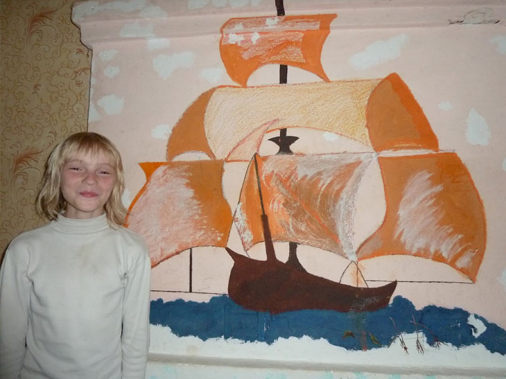 Schwaches Licht dringt in die alte Hütte, leuchte auf eine Wand mit einer alten Tapete. Daneben schwimmt ein wunderschönes Schiff. Lilia strahlt über ihr ganzes Gesicht: „Tante Aliona, das hab ich gemalt.“