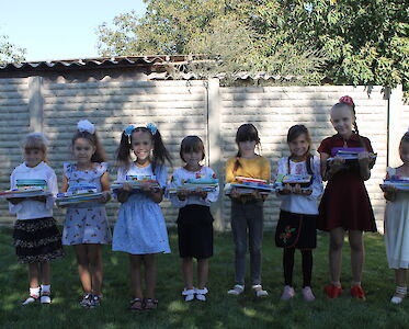 Auch in unserem „Zufluchtsort“ in Pawliwka haben wir ein Fest zu Beginn des neuen Schuljahres gefeiert. Schon im Vorfeld bestürmten die Kinder unsere Mitarbeiter: „Tante Wika, ich habe für die Schule kein einziges Heft. Meine alte Mappe ist zerrissen, der Kugelschreiber schreibt nicht mehr. Meine Mama sagt, sie hat kein Geld, um Schulmaterial zu kaufen.“ Veronika, Diana und Anja machten sich große Sorgen. Der Krieg im Land bringt alle Pläne durcheinander.