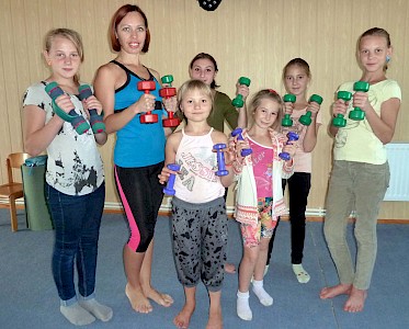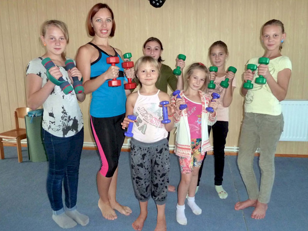 Olga hat Gewichte und Springseile für das Training mitgebracht. Einige der Teilnehmer haben Rückenschmerzen oder sie haben andere körperliche Probleme. Ärzte gaben ihnen den Ratschlag sich körperlich zu betätigen.