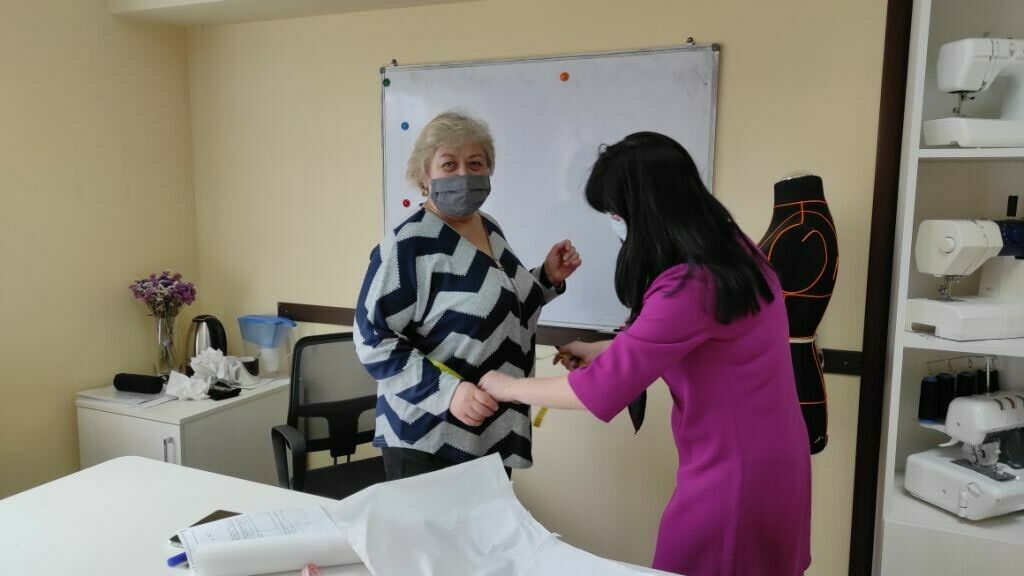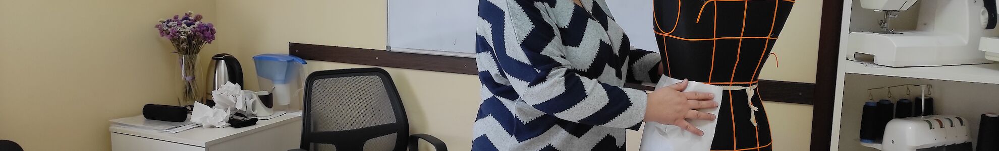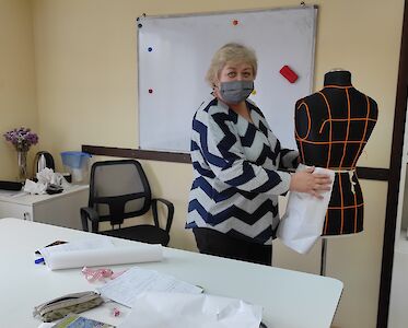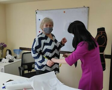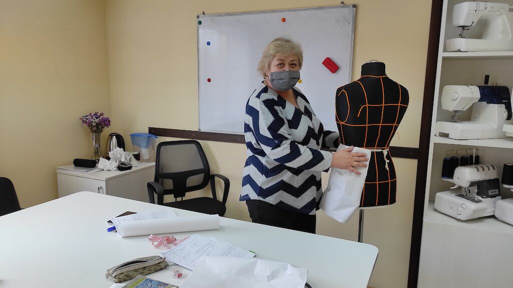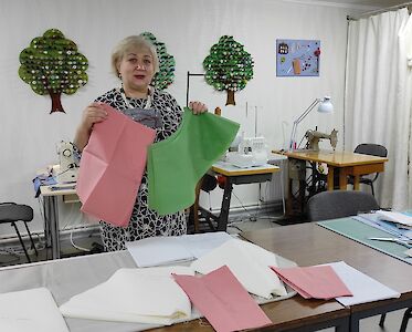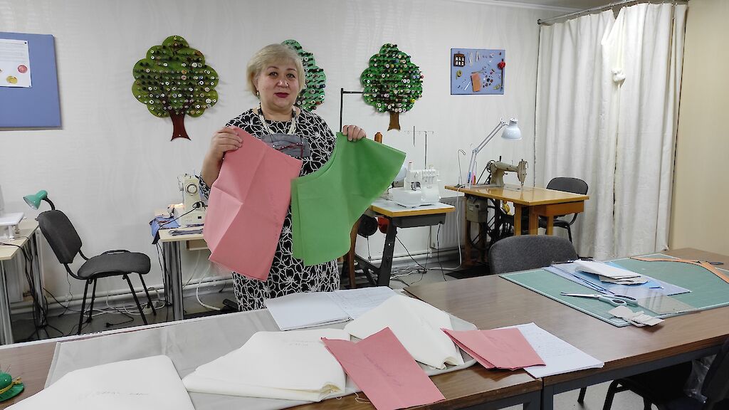 Doch es geht nicht nur darum, dass wir unsere Kinder fördern, auch unsere Mitarbeiterinnen müssen sich weiterentwickeln. Lena Grabenko leitet unsere „Lehrwerkstatt“, in der ihre Lehrlinge auf den Beruf einer Schneiderin vorbereitet werden.