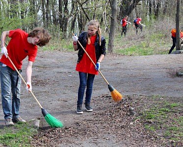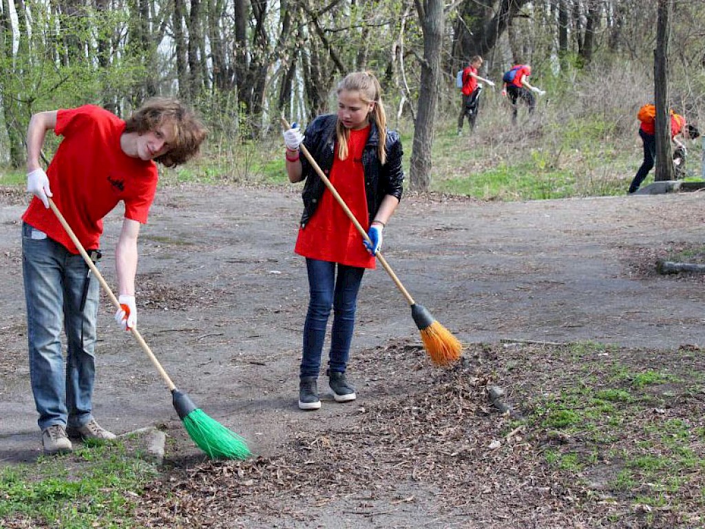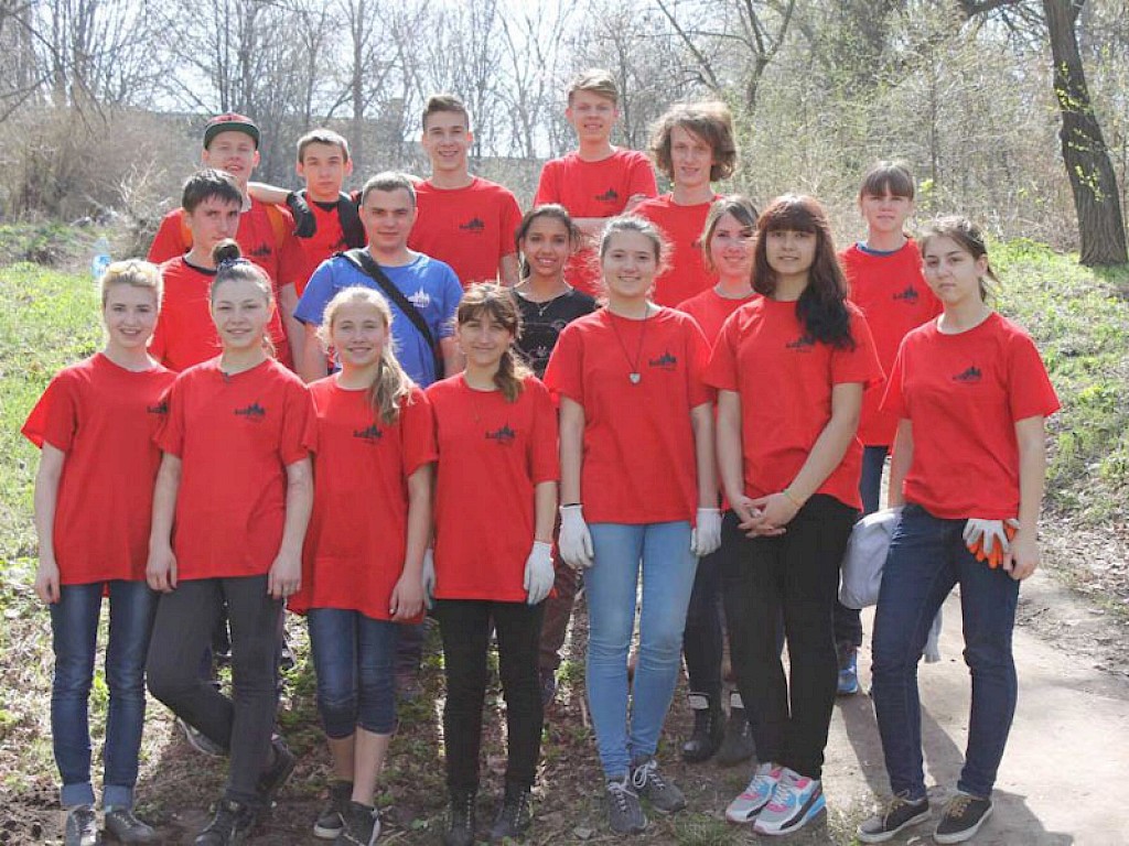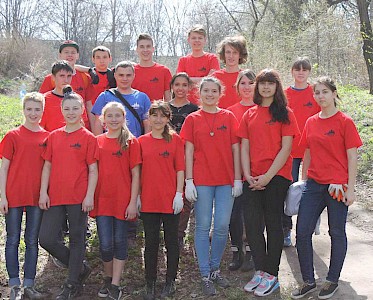 Heute hat die Stadtverwaltung von Swetlowodsk zu einem großen Frühjahrsputz eingeladen. Da wollen unsere Jugendlichen selbstverständlich mithelfen. Schon am frühen Morgen treffen sich unsere Teenager hinter „Villa Sonnenschein“, ziehen sich ganz stolz ihre T-Shirts an, um zu zeigen, dass sie von „Brücke der Hoffnung“ kommen. Dann machen sie sich auf den Weg.
