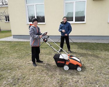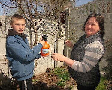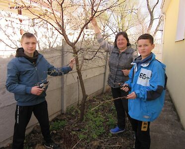 Es ist Frühling in der Ukraine, das Gras sprießt, die Bäume blühen. Trotz des Krieges sind unsere Mitarbeiter mit der Gartenpflege beschäftigt. Anja Losowaja ist in Switlowodsk dafür verantwortlich. Sie hat zwei fleißige Helfer, die sie im Rahmen eines Minijobs unterstützen. Dima und Ljoscha mähen den Rasen. Sie lernen, wie man Obstbäume beschneidet und diese gegen Schädlinge behandelt, wie man Blumenbeete pflegt. Anja zeigt den Jungen unsere Rasenmäher, erklärt geduldig alle „Geheimnisse“ der Gartenarbeit. Solch professionelle Werkzeuge kennen sie von zuhause nicht. Dima und Ljoscha arbeiten gerne mit Anja zusammen.