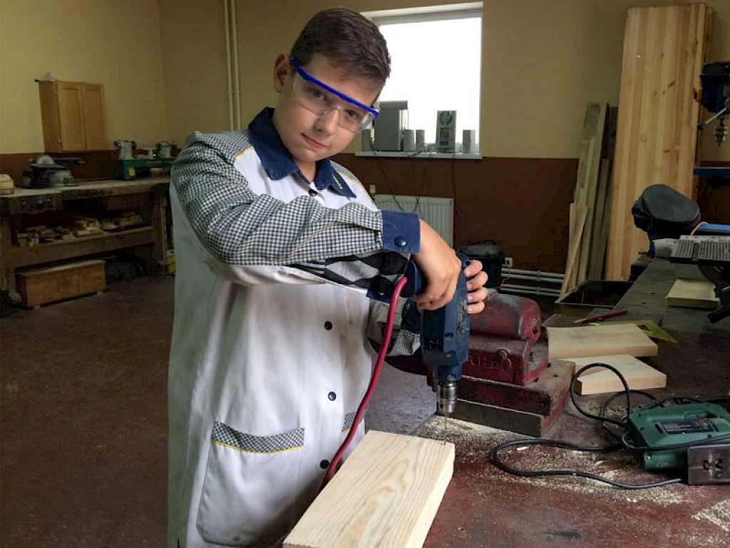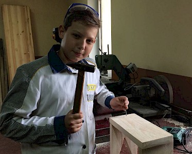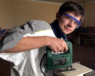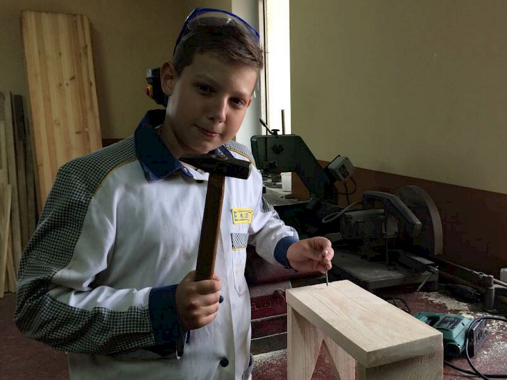 Nun hatten unsere Jungen die Idee einen Fußschemel zu bauen. Stas Sokoljuk, der sich beworben hat, ein „Junger Missionar“ zu werden, würde gerne einen dieser Hocker seiner Großmutter schenken, die in einem „Vergessenen Dorf“ wohnt, um ihr zu zeigen, was er schon alles kann. Die ersten Schemel sind bereits fertig und unsere Lehrlinge sind ganz stolz.