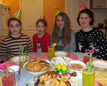 Nastja hat Kartoffeln gekocht, Wika und Sofia haben ein buntes Plakat gemalt. Im Ofen brutzelt bereits ein Hähnchen. Galja ist für den Salat zuständig. Alle haben viel Spaß. Natürlich ziehen sich die Mädels festlich an, singen ein Geburtstagslied, wünschen Galja alles Gute. Galja ist tief bewegt.