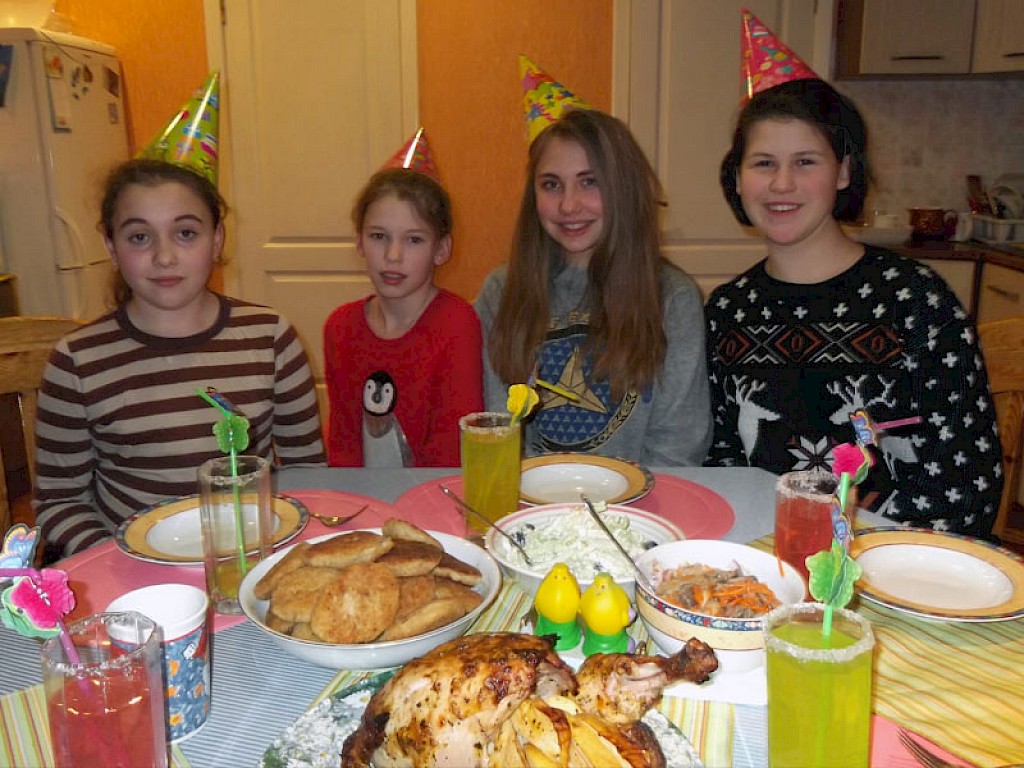 Nastja hat Kartoffeln gekocht, Wika und Sofia haben ein buntes Plakat gemalt. Im Ofen brutzelt bereits ein Hähnchen. Galja ist für den Salat zuständig. Alle haben viel Spaß. Natürlich ziehen sich die Mädels festlich an, singen ein Geburtstagslied, wünschen Galja alles Gute. Galja ist tief bewegt.