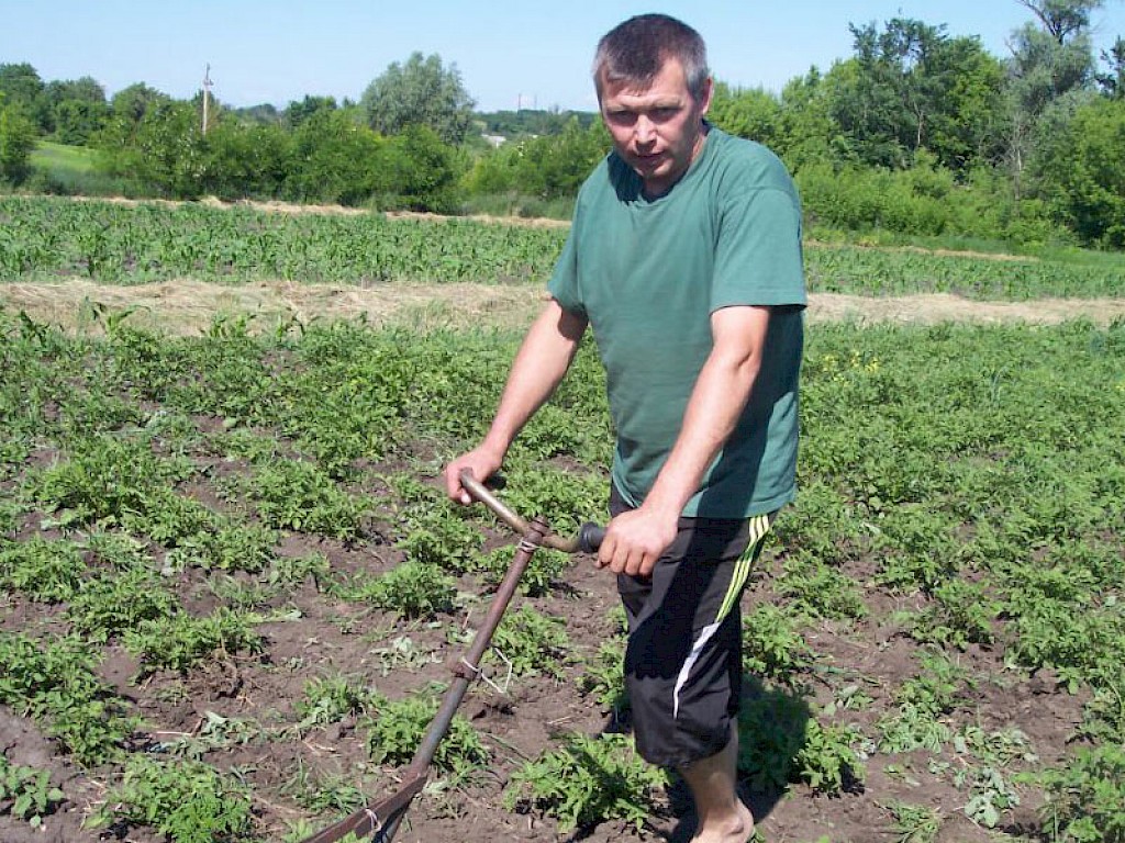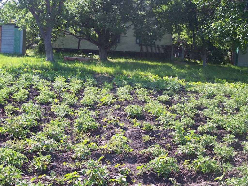Hinter unserem „Zufluchtsort“ in Odarjewka erstreckt sich ein großer Acker von fast 5.000 Quadratmetern, auf dem wir Kartoffeln gepflanzt haben. Jaroslaw Galagowetz ist für unsere landwirtschaftlichen Projekte in Schorsk und Odarjewka zuständig. Bei über 30 Grad ist es oft nicht leicht alle Kartoffel- und Gemüseaktionen durchzuführen.