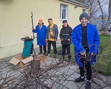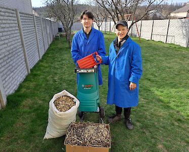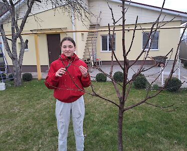 „Ich möchte lernen, wie man die Aprikosenbäume beschneidet. Dann werden die Früchte bestimmt größer und leckerer,“ meint Tamara. Zusammen mit unseren Mitarbeitern sind einige Teenager, die wir in einem Minijob beschäftigen, in unseren Gärten unterwegs. Die Jungen und Mädchen haben Bäume und Sträucher zurückgeschnitten. Von unserem neuen Gartenhäcksler sind alle begeistert! „Ich kann es gar nicht erwarten, damit zu arbeiten. Die zerkleinerten Äste geben wir nachher auf die Blumenbeete,“ sagt Wladik. Die Rasenflächen wurden bereits belüftet, der fertige Kompost untergegraben und der Garten nach dem langen Winter aufgeräumt.