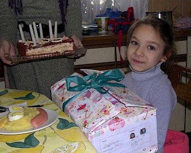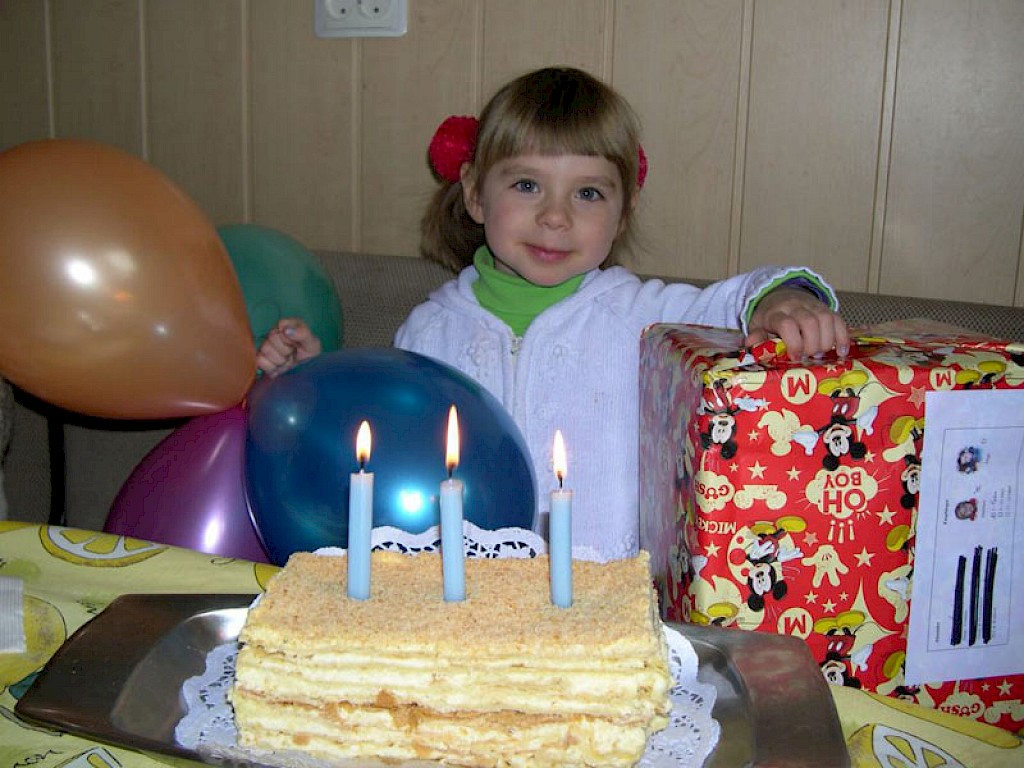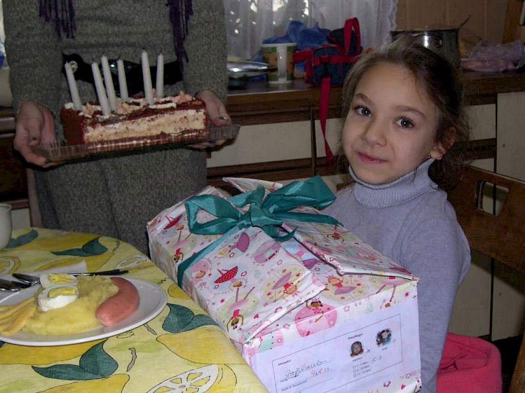 Gespannt sitzen die Kleinen auf ihren Stühlen, als Olga Schumilo einen Kuchen mit Kerzen in das Zimmer trägt und Wera Beresniuk heißen Kakao bringt. Und Geschenke, die gibt es natürlich auch zu einem Geburtstag. Es ist ein gelungenes Fest.