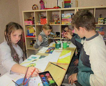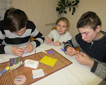„Sonja, was machst du denn so am Abend?“ Natascha Mitina hat ein paar Kinder im „Zufluchtsort“ in Boschedarjewka zu einem Handarbeitsabend eingeladen. Einige Mädchen spielen mit ihren selbstgebastelten Puppen. Ein Junge erzählt, dass er bis spät abends auf seinen Vater wartet, der dann meistens betrunken ist.