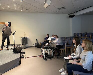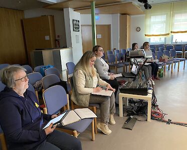 Am Montagvormittag fand die erste Probe statt. Die Verstärkeranlage und der Beamer wurden in unserer Heimatgemeinde in Rechtenbach aufgebaut. In den kommenden drei Stunden wurden die Lieder noch einmal gesungen, wurden die Bilder an die Texte angepasst.