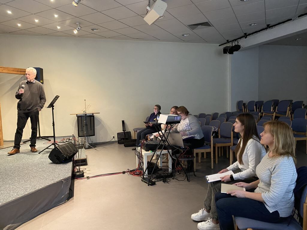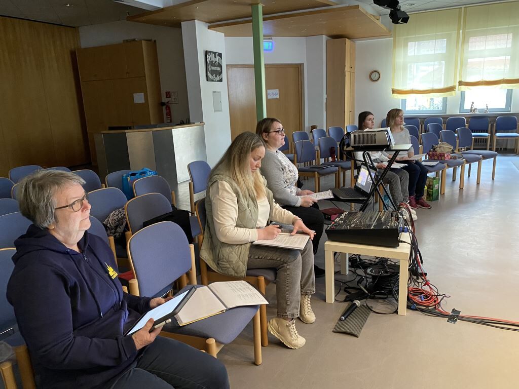Am Montagvormittag fand die erste Probe statt. Die Verstärkeranlage und der Beamer wurden in unserer Heimatgemeinde in Rechtenbach aufgebaut. In den kommenden drei Stunden wurden die Lieder noch einmal gesungen, wurden die Bilder an die Texte angepasst.