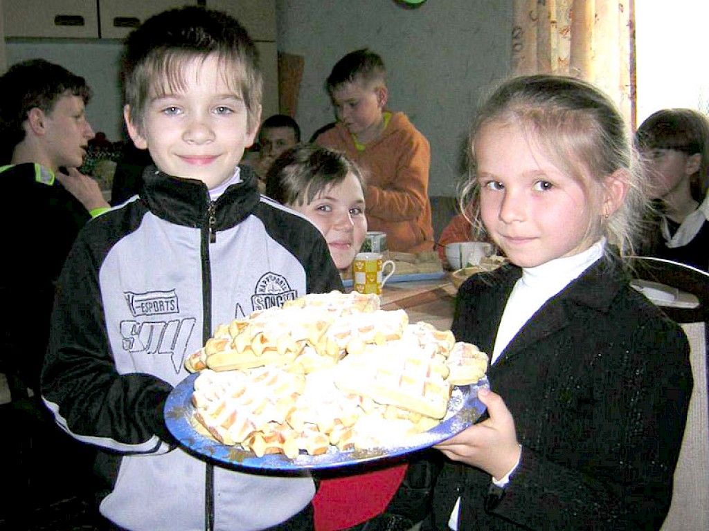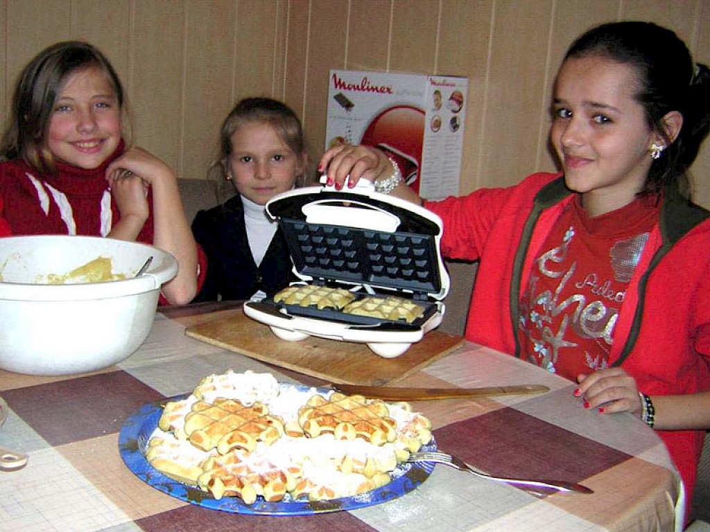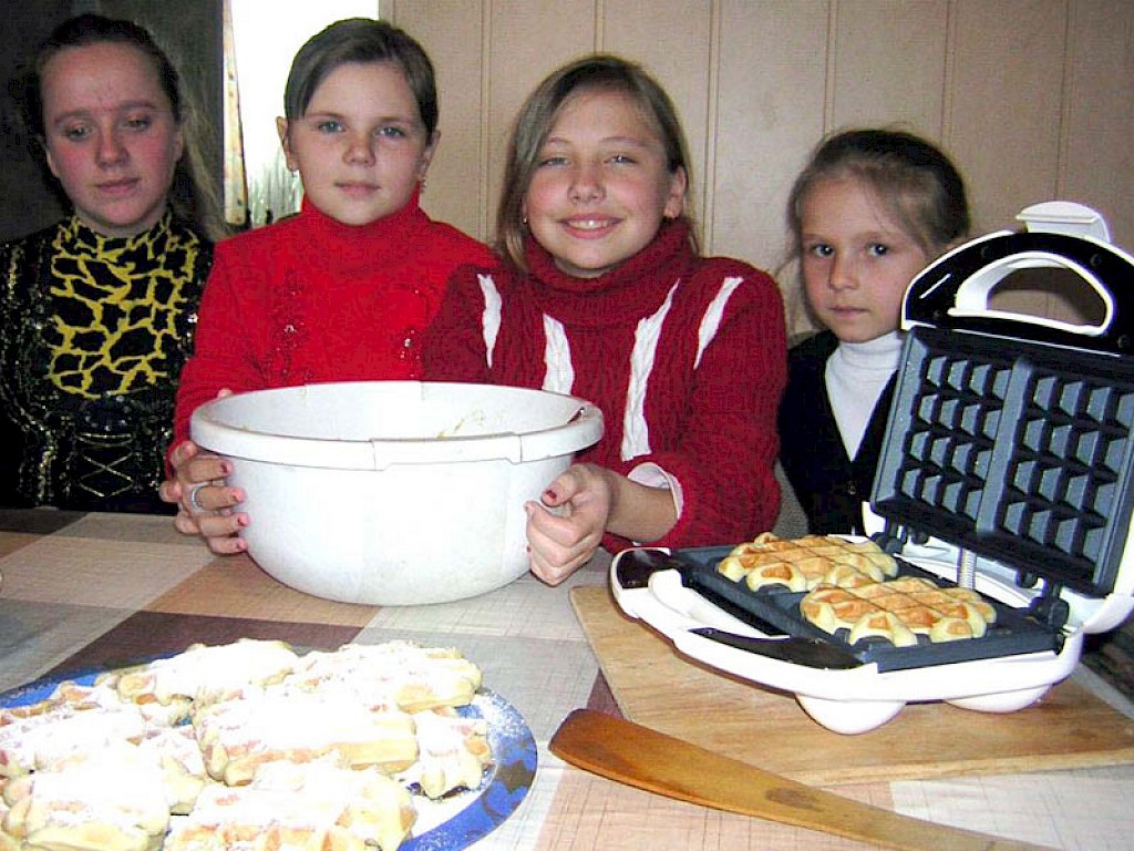 Heute macht Lena Uchnal, die unsere „Villa Sonnenschein“ leitet, ein ganz mysteriöses Gesicht und stellt einen geheimnisvollen Karton auf den Tisch. „Kinder, das ist ein ganz besonderes Geschenk von einer Sonntagsschule aus Osnabrück!“ Die Jungen und Mädchen können es kaum glauben, als wir ein neues Waffeleisen auspacken.