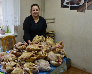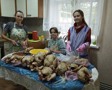 Einen Teil der geschlachteten Tiere hat sie an unseren Zufluchtsort in Boschedariwka abgegeben. Unsere Kinder werden nun leckere Hühnersuppe und Brathähnchen zu essen bekommen.