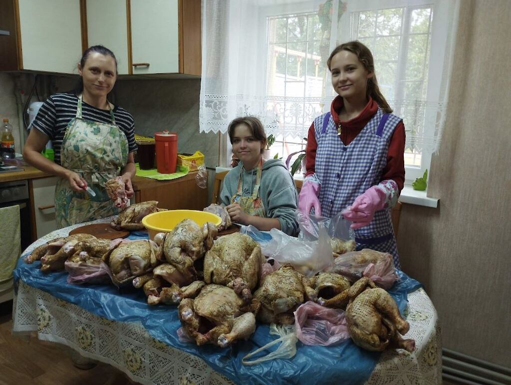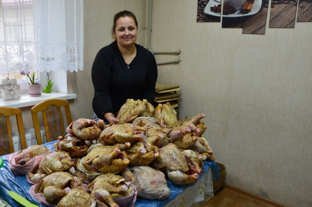 Einen Teil der geschlachteten Tiere hat sie an unseren Zufluchtsort in Boschedariwka abgegeben. Unsere Kinder werden nun leckere Hühnersuppe und Brathähnchen zu essen bekommen.