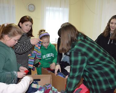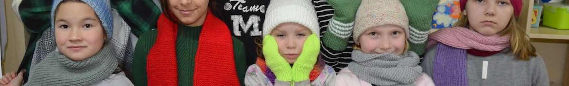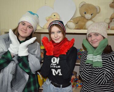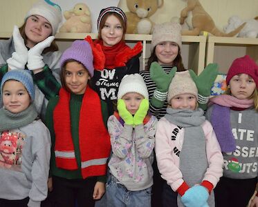 Unsere Kinder in unserem Zufluchtsort in Odariwka durften warme, selbstgestrickte Socken, Mützen und Schals anprobieren und aussuchen.