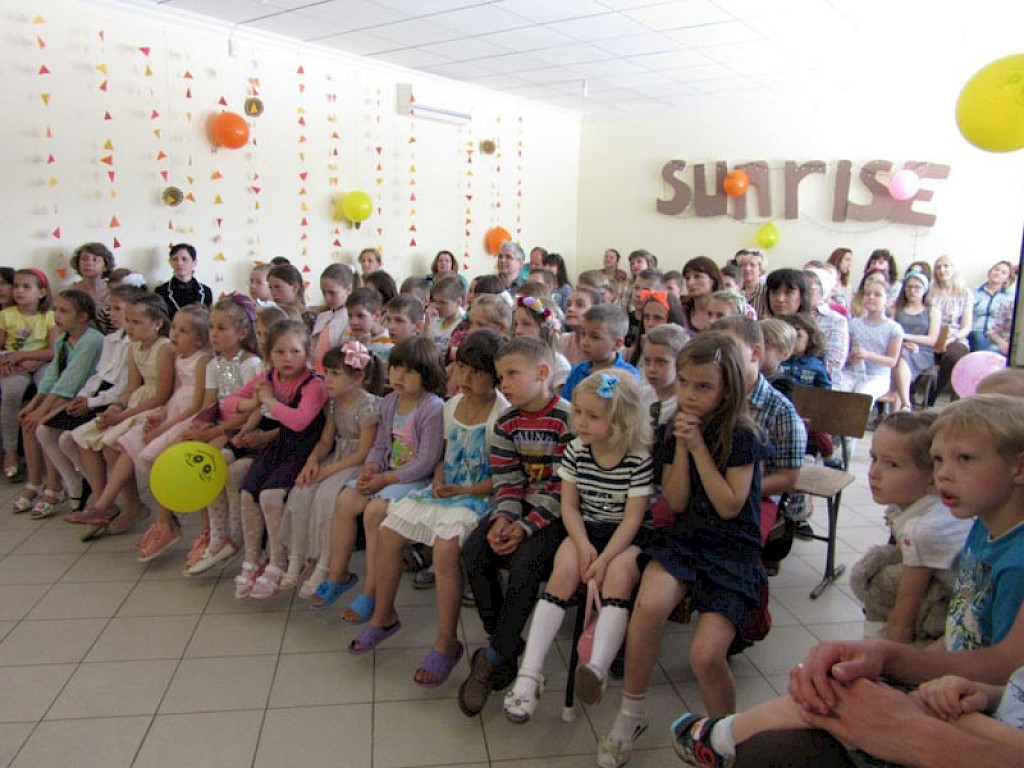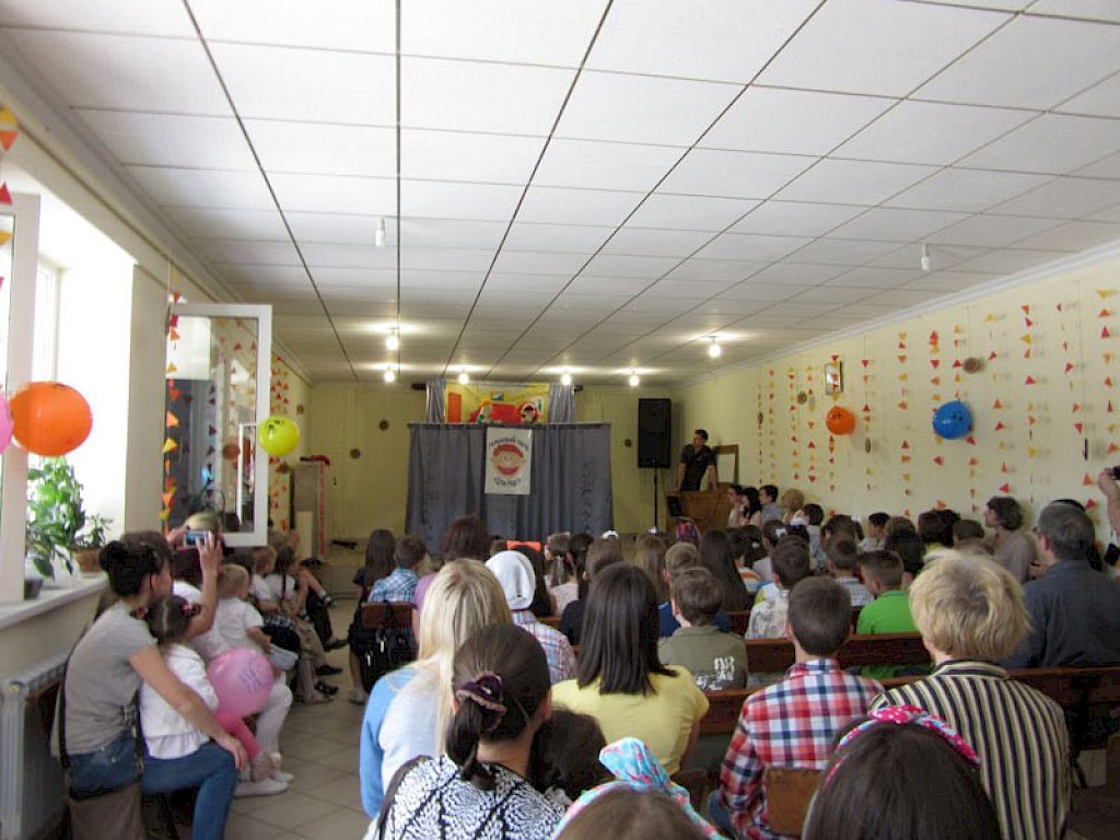 An der schweren Eingangstür der größten Gemeinde in Swetlowodsk hängt ein lustiges Plakat: „Herzlich willkommen zum Puppentheater von „Brücke der Hoffnung“ an diesem Sonntag. Alle Kinder sind eingeladen!“