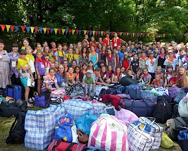 Hell scheint die Sonne auf unseren großen Lagerplatz. Tiefe Erleichterung macht sich nach dem gestrigen Sturm unter den Mitarbeitern breit, als die ersten Autos und auch die Busse um 10.30 Uhr den Lehmweg hinunter zum Lager bewältigt haben. 70 Kinder im Alter von 10 bis 15 Jahren strömen erwartungsvoll zur Anmeldung. „Herzlich willkommen im Trainingslager „Gut in Form sein“ für besonders gute Sportler!“ Jedes Kind bekommt einen Sportlerausweis, findet durch verschiedene Aufgaben an kreativen Stationen sein Team samt Teamleiter.