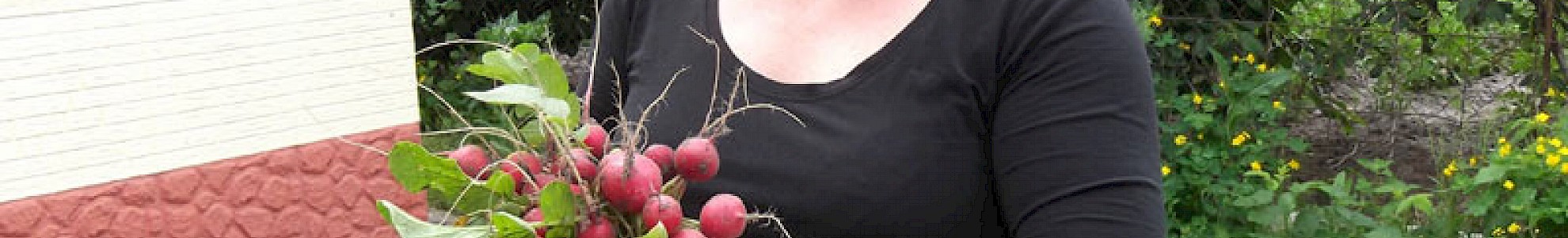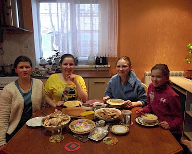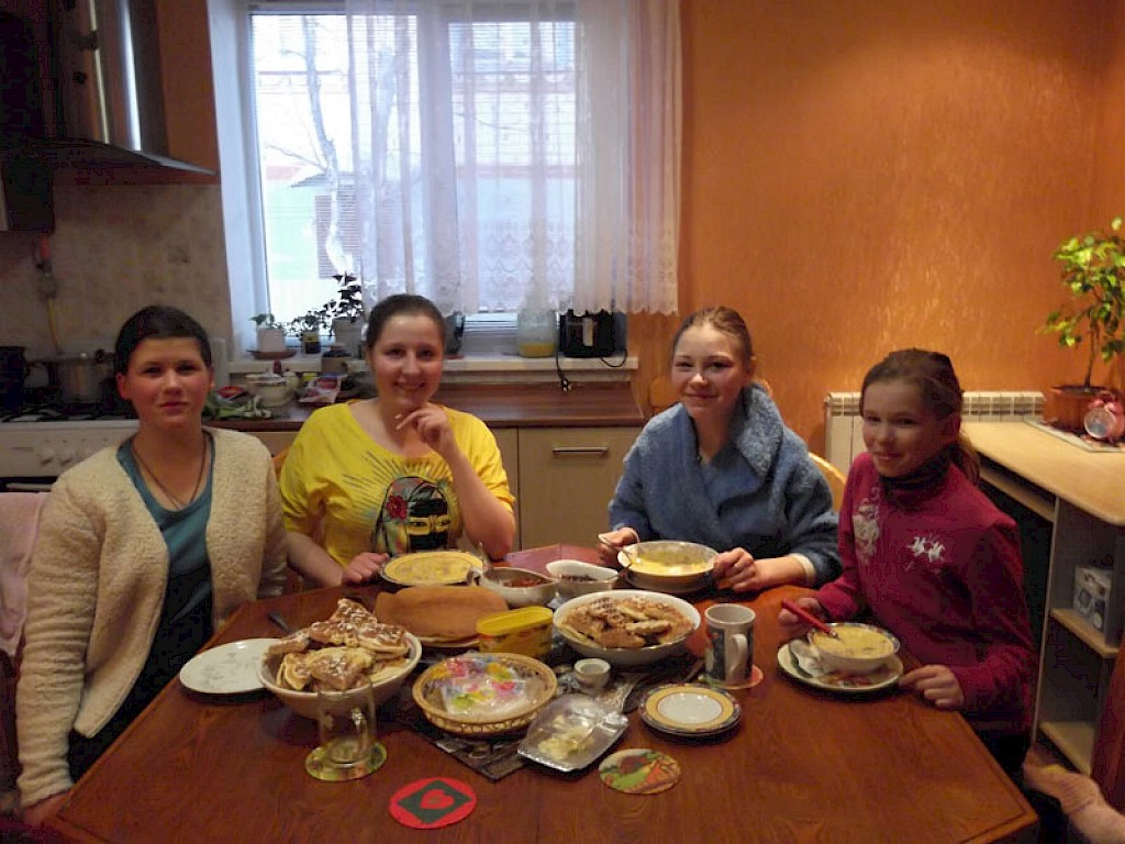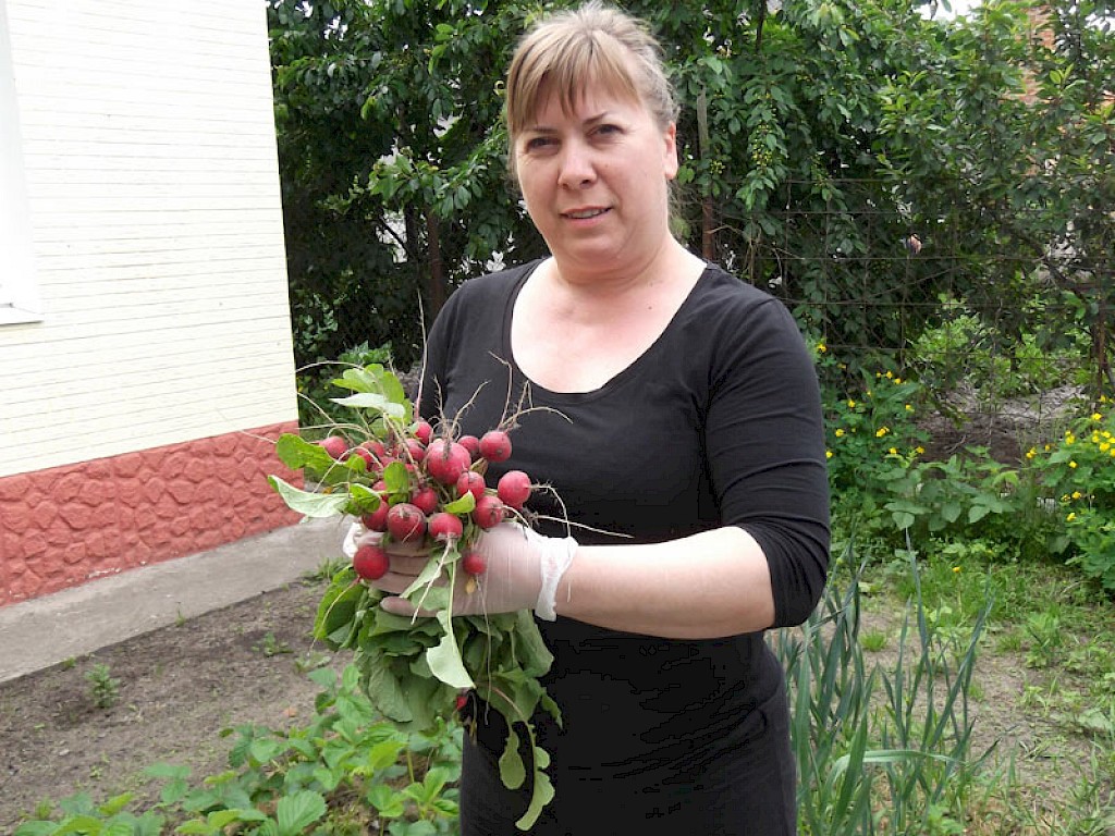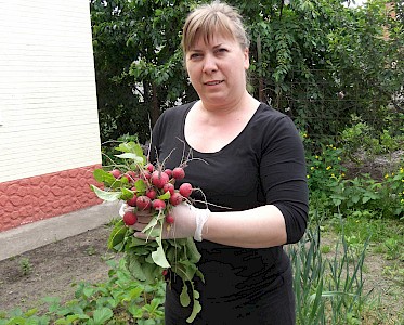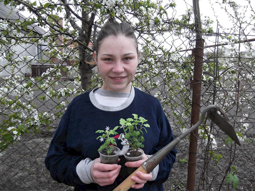 Hinter unserer „Villa Regenbogen” liegt ein Garten. Hier züchtet Aliona Raschkowa Zwiebeln, rote Beete, Salat. Galja Bereschnaja, eines der Mädchen, das in diesem Haus wohnt, hat Blumen angepflanzt. Wika Solonienko ist für das Gemüse zuständig.