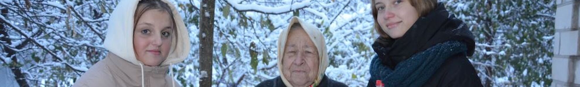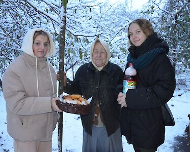 Die Mitarbeiter tun alles, damit die Kinder mitten im Krieg in die Weihnachtsatmosphäre eintauchen können. In unserem Zufluchtsort in Boschedariwka bekamen die Mädchen und Jungen die Aufgabe sich zu überlegen, was sie anderen Gutes tun können. Die Mädchen wussten sofort, dass sie die blinde Großmutter besuchen wollen, um die sie sich kümmern. Wie hat sich die Oma gefreut! Unter Tränen bedankte sie sich für den Besuch und die mitgebrachten Leckereien.