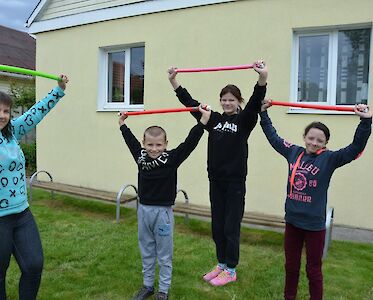 Heute stoppt das fröhliche Treiben kein Sirenengeheul. Die Kinder laufen begeistert durcheinander, strecken sich und hüpfen. Während der gymnastischen Übungen werden sie von ihren Ängsten und Sorgen abgelenkt. Auf diese Weise fördern wir nicht nur die körperliche, sondern auch die psychische Gesundheit der Kinder.