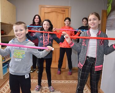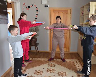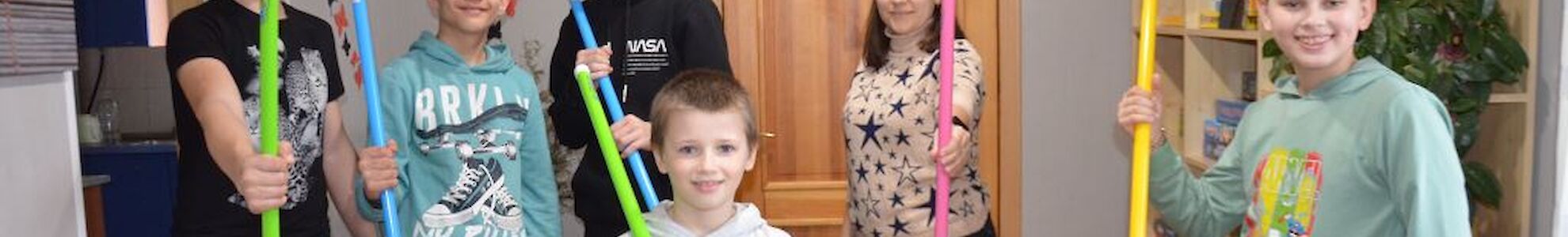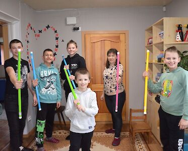 „Was sind das für Stöcke?“ „Was machen wir denn heute?“ In unserem Tageskinderheim am See sehen sich die Kinder fragend an. „Das sind Gymnastikstangen“, klärt sie Nastja, unsere neue Mitarbeiterin auf. Nastja ist Krankenschwester und kümmert sich um die Gesundheit unserer Kinder. Während des Krieges findet oft keine Schule statt und wenn die Kinder Schulunterricht haben, müssen sie häufig Schutzräume aufsuchen. „Heute saßen wir wieder auf den Bänken im kalten Keller. Jetzt tut mir der Rücken weh“, beklagt sich Sofia.