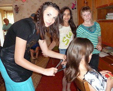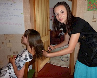 Alina, die Tochter von Oxana Naumtschuk, die eine Gruppe im „Tageskinderheim am See“ leitet, erlernt den Beruf einer Frisörin. Alina hat uns bereits Seminare über Haarpflege gehalten und einige der Mädchen haben den Entschluss gefasst: „Ich will auch einmal eine Frisörin werden!“