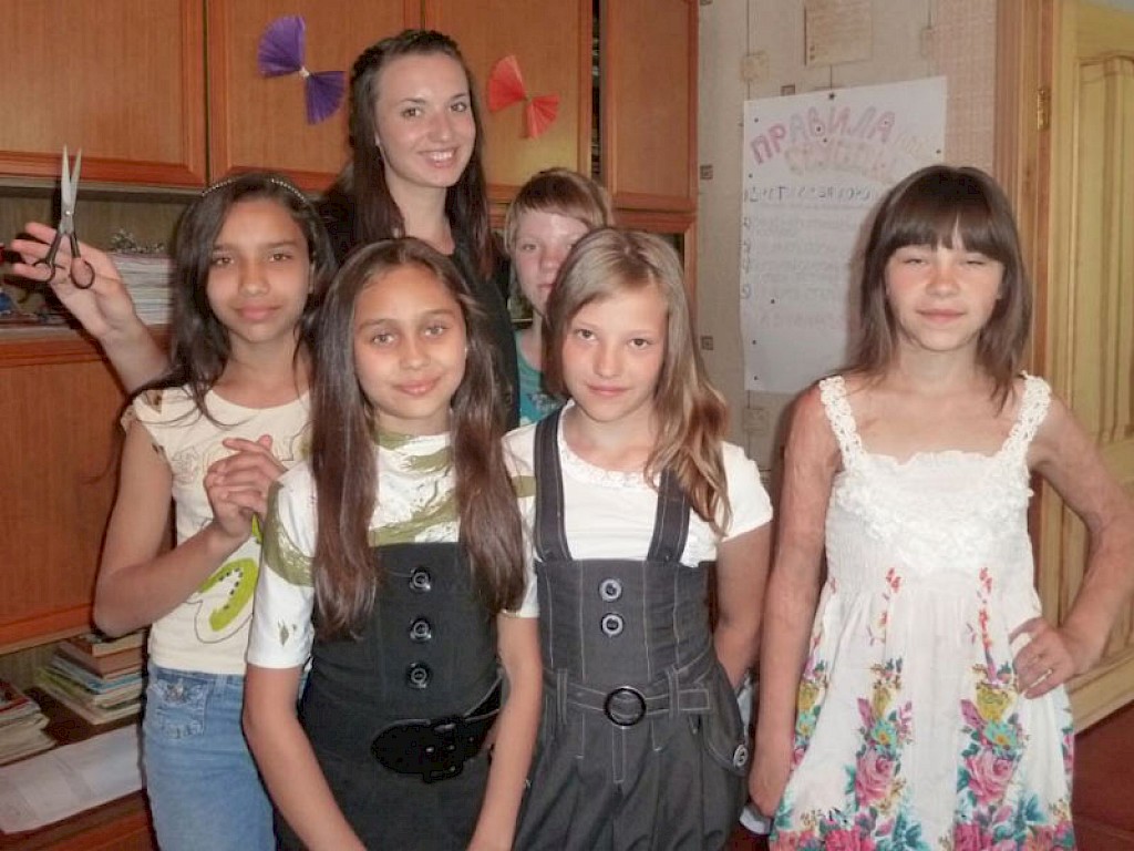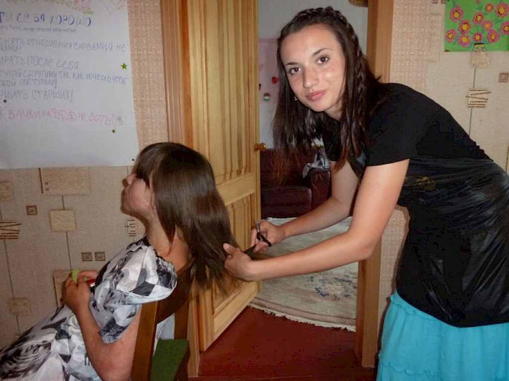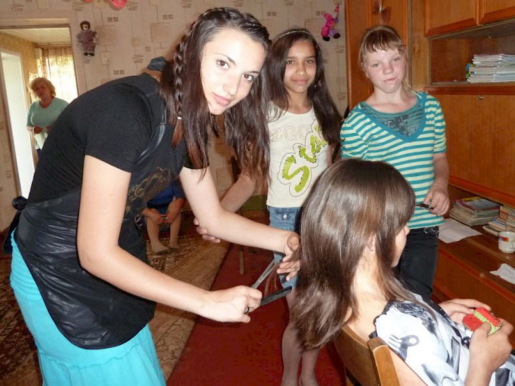 Alina, die Tochter von Oxana Naumtschuk, die eine Gruppe im „Tageskinderheim am See“ leitet, erlernt den Beruf einer Frisörin. Alina hat uns bereits Seminare über Haarpflege gehalten und einige der Mädchen haben den Entschluss gefasst: „Ich will auch einmal eine Frisörin werden!“