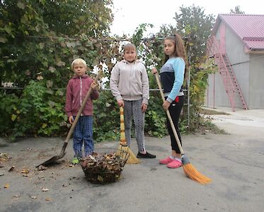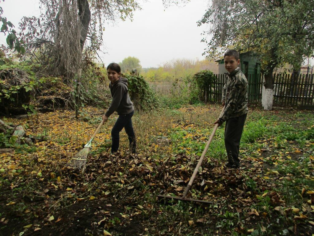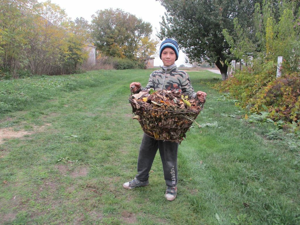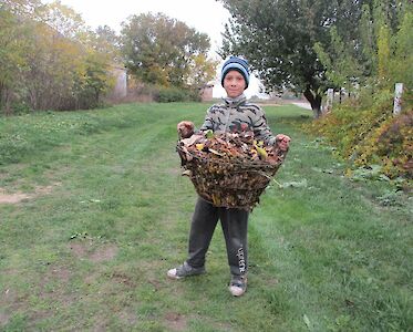 Natürlich fallen auch in unseren Gärten die Blätter von den Bäumen. Und weil wir auch in unseren Gärten Ordnung haben wollen, melden sich jeden Tag Kinder, die begeistert an die Arbeit gehen, die mit helfen, die Blätter zusammen zu harken.
