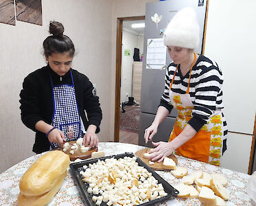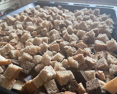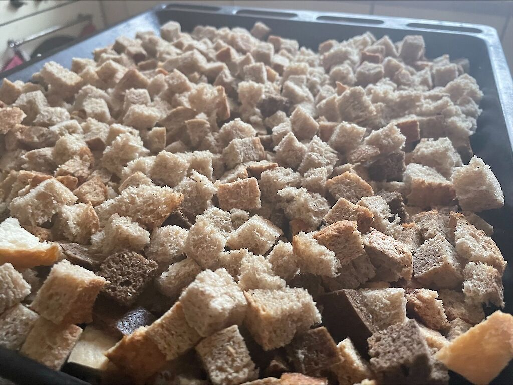 Unsere Mitarbeiter wollen gerüstet sein. Sie haben Brot in kleine Scheiben geschnitten, gebacken und getrocknet. Zwieback ist lange haltbar und enthält trotzdem wertvolle Nährstoffe. Ideal für Zeiten wenn die Lebensmittel noch knapper werden.