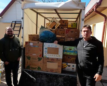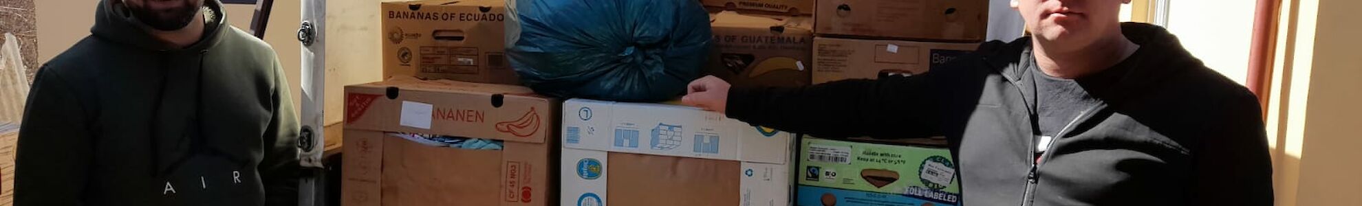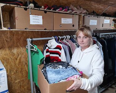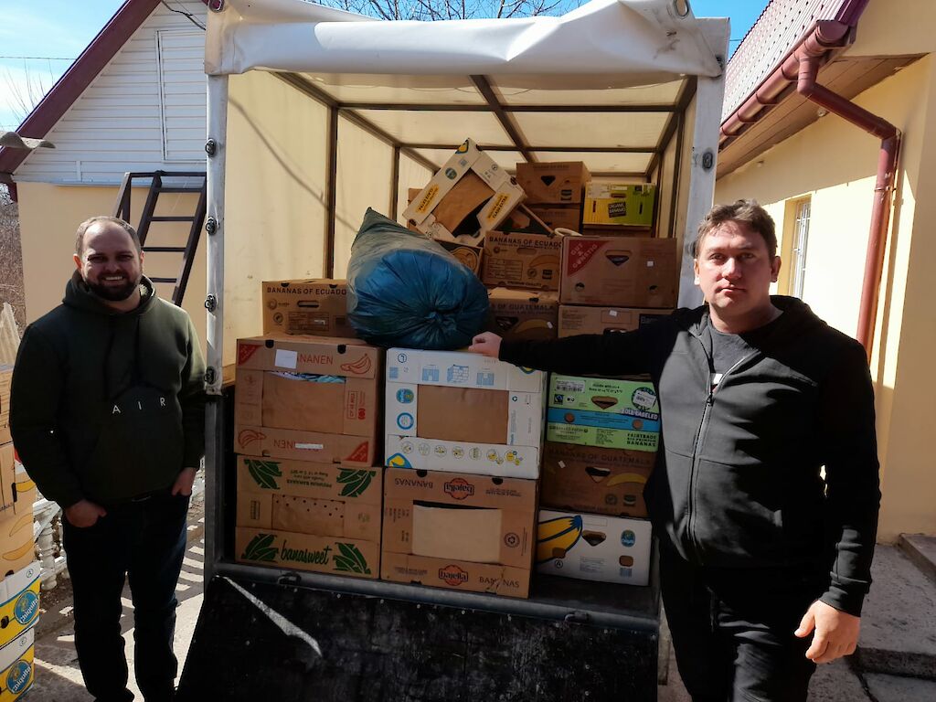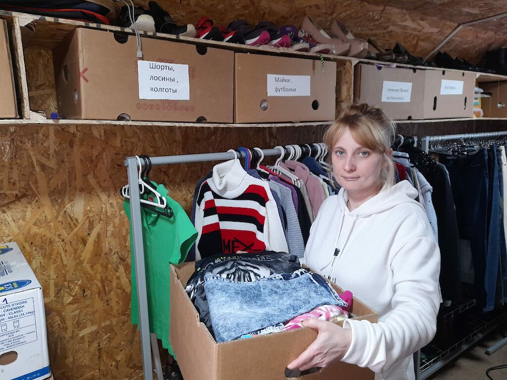 Dima Grabenko und ein Freund brachten die Sachen nach Boschedarjiwka und Mascha Galagowetz und Lena Latoschenko haben jetzt alle Hände damit zu tun, die Hilfsgüter an Familien weiterzugeben.
