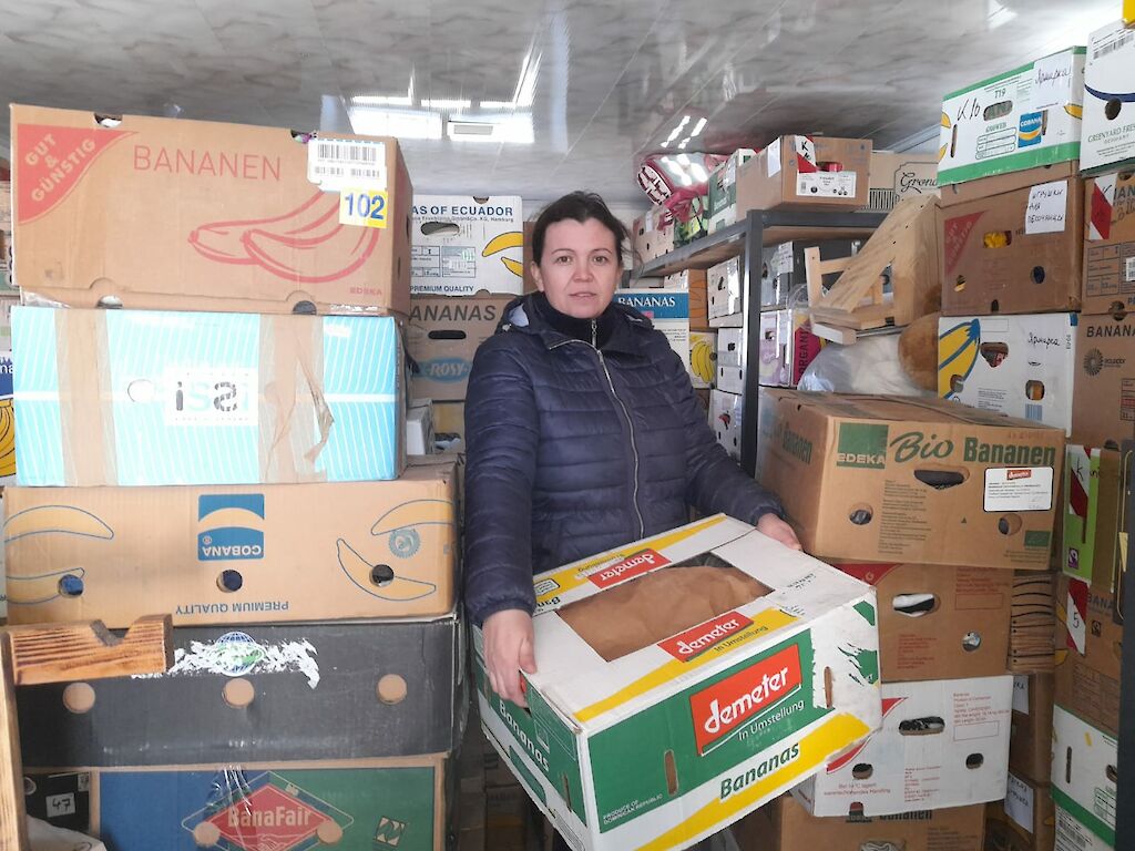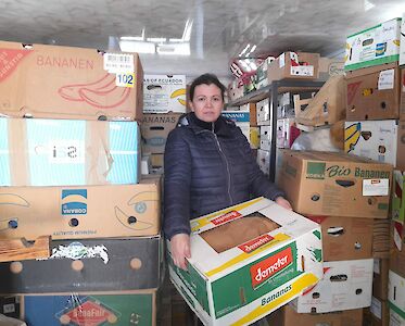 In Boschedarjiwka ist die Versorgungslage aktuell schlechter als in Switlowodsk. Also haben unsere Mitarbeiterinnen in Switlowodsk kurzerhand Lebensmittelpakete für Familien im 150 km entfernten Boschedarjiwka gepackt und auch Kleidung für den Frühling für Kinder herausgesucht, denn erst der nächste Transport wird unser Lager dort wieder auffüllen.