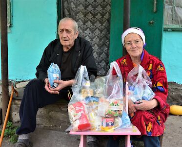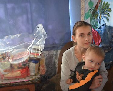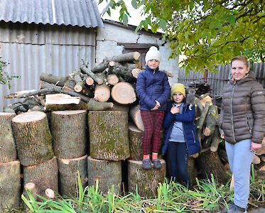 Tanja Galjanskaja bekam ein Paket voller Lebensmittel und Süßigkeiten für ihre Kinder. „Ich werde die Kekse und die Schokolade verstecken. Meine Kinder bekommen jeden Tag nur ein bisschen davon, damit die Süßigkeiten lange reichen.“ Neben Winterkleidung und Schulmaterial haben wir einer anderen Familie Brennholz vorbeigebracht, das nun in der kleinen Scheune lagert. „Unsere Oma hat gesagt, ihr helft uns. Sonst interessiert sich niemand für uns.“ Lera und Vera sind Waisenkinder.