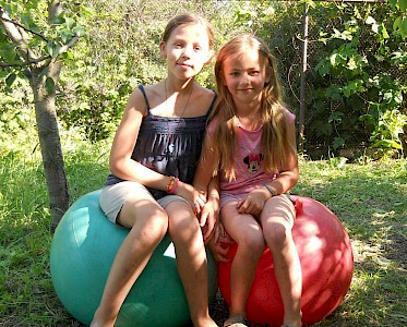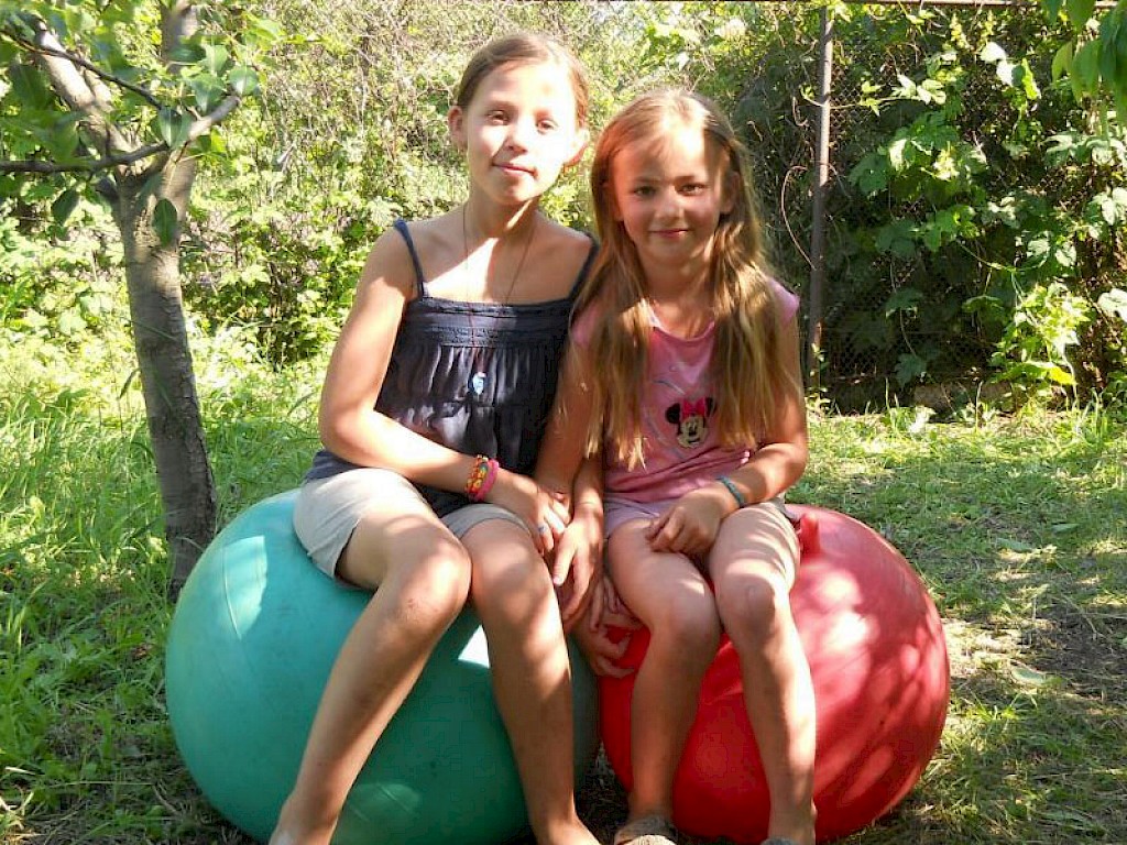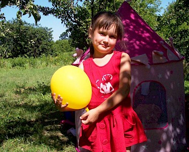 Lautes Lachen schallt durch den Garten von unserem „Zufluchtsort“ in Schorsk. Es ist wunderbar, dass wir uns an warmen Sommertagen im Garten aufhalten können. Der letzte Hilfsgütertransport hat uns eine Bierzeltgarnitur, einen Hüpfball, ein buntes Zelt und vieles mehr mitgebracht.