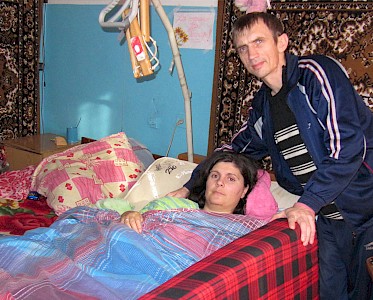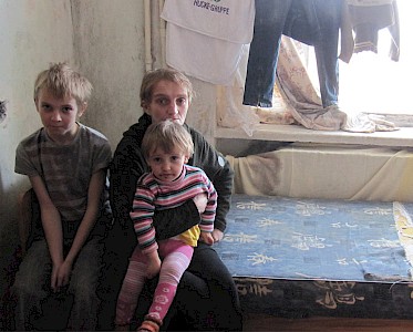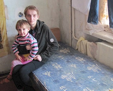 Heute sind wir bei Oxana zu Besuch. Sie wohnt mit ihren beiden Kindern in einem kleinen Zimmerchen ohne Heizung in einem Hochhaus im neunten Stockwerk. Wir bringen ihr ein Bett, sodass sie getrennt von ihrem Sohn schlafen kann. Im Anschluss erhält eine behinderte Frau eine Matratze.