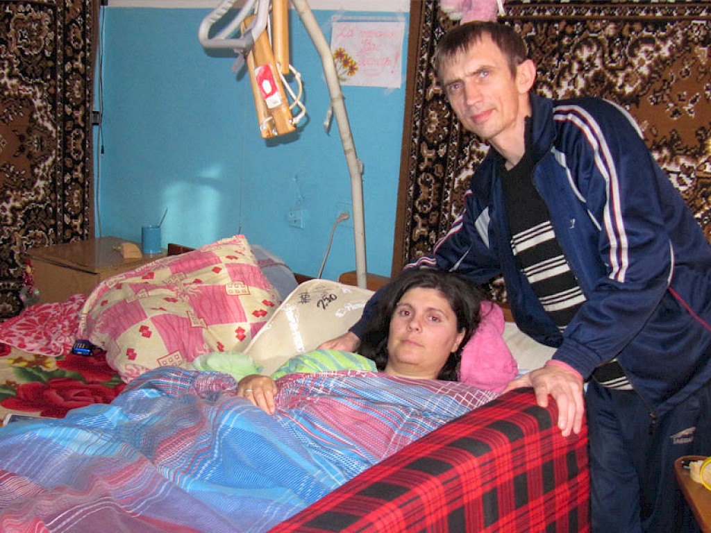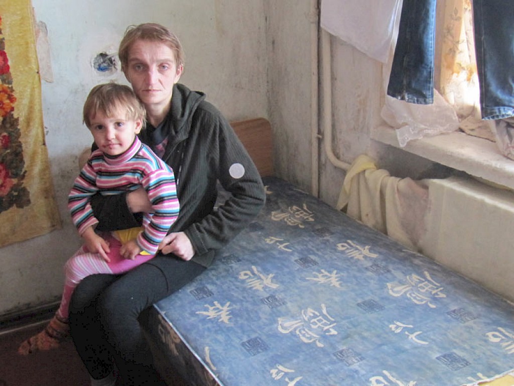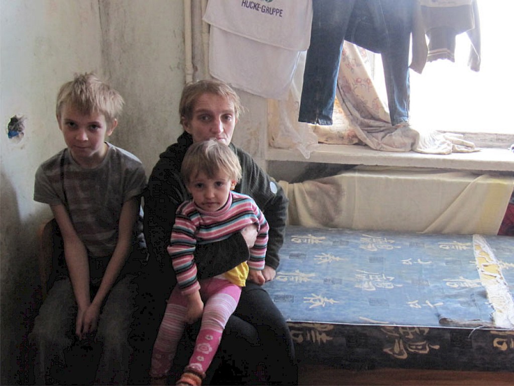 Heute sind wir bei Oxana zu Besuch. Sie wohnt mit ihren beiden Kindern in einem kleinen Zimmerchen ohne Heizung in einem Hochhaus im neunten Stockwerk. Wir bringen ihr ein Bett, sodass sie getrennt von ihrem Sohn schlafen kann. Im Anschluss erhält eine behinderte Frau eine Matratze.