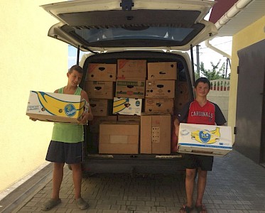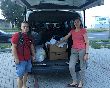Nun fahren unsere Mitarbeiter oft in Nachbarstädte, um die Hilfsgüter abzuholen. Unsere „Jungen Missionare“ helfen uns dabei. Alles wird in unserer Lagerhalle in Swetlowodsk sortiert und zu bedürftigen Familien gebracht.