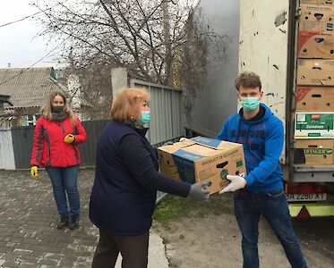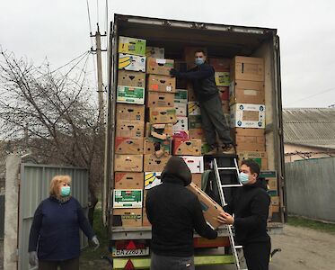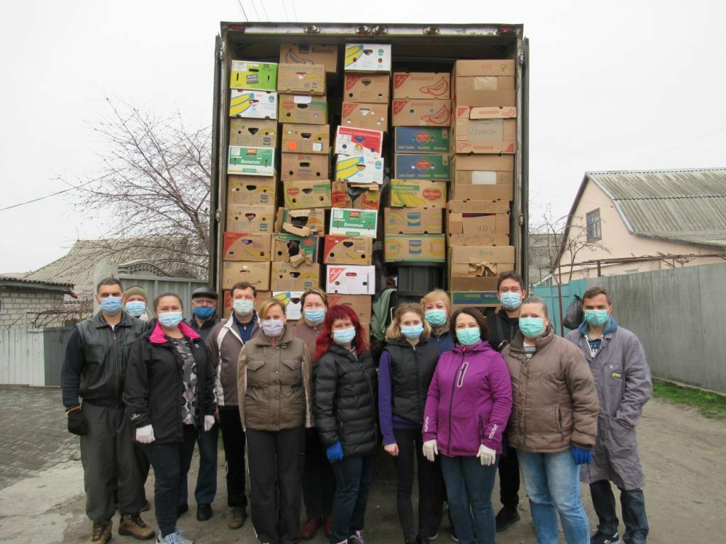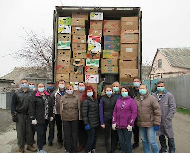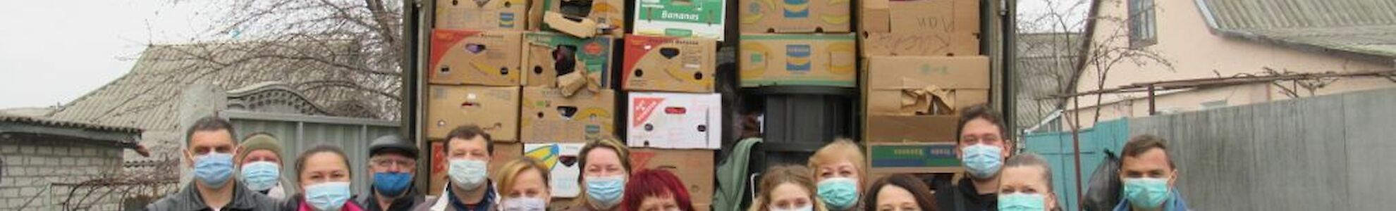 Es ist immer ein großer Augenblick, wenn unser LKW vollbeladen in einem unserer Büros in der Ukraine eintrifft. Unsere Mitarbeiter und Helfer stehen bereits bereit, um etwa 1.800 Bananenkartons unter der Aufsicht eines Zollbeamten in unsere Lagerhalle abzuladen. Danach wird die Lagerhalle von dem Beamten versiegelt.