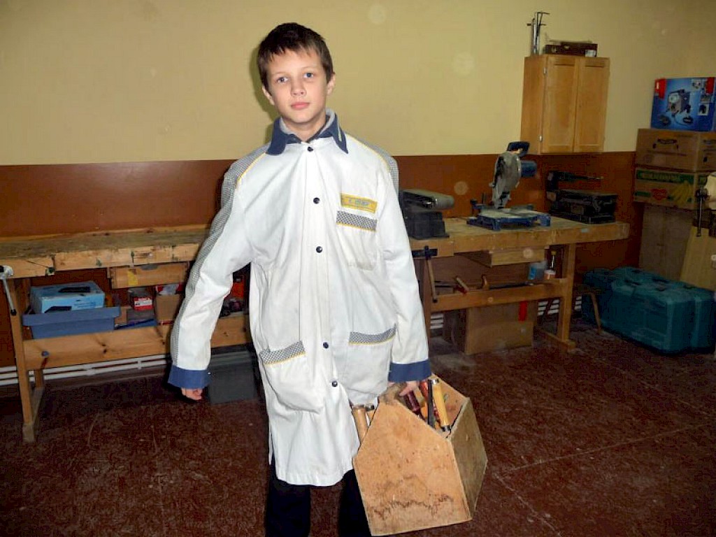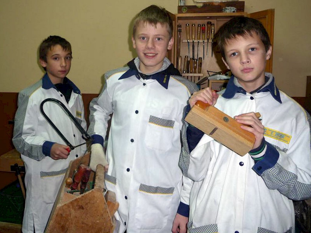 Gespannt schauen einige Jungen auf Oleg Kurbatow, der unsere „Lehrwerkstatt“ leitet. Heute treffen sie die kleineren Jungen, die in einigen Monaten oder Jahren unsere „Lehrwerkstatt für Jungen“ besuchen wollen.